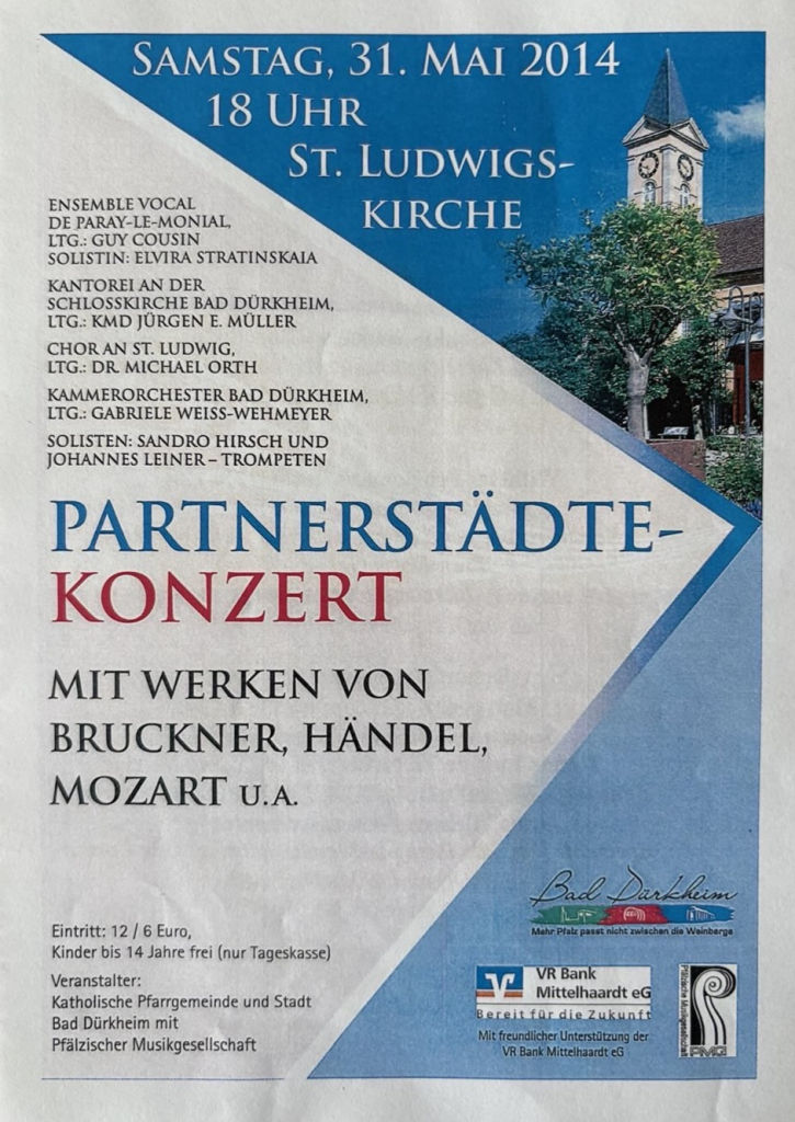16.05.2026, 18:00 Uhr – Partnerschaftskonzert mit dem Ensemble vocal de Paray-le-Monial, Kantorei an der Schlosskirche Bad Dürkheim, Chor an St. Ludwig Bad Dürkheim, Kammerorchester Bad Dürkheim, St. Ludwigskirche, 67098 Bad Dürkheim